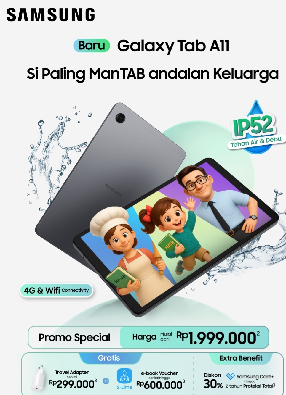 Galaxy Tab A11 tersedia dalam warna Gray pada dua pilihan: varian Wi-Fi pada harga Rp 1.999.000, dan varian LTE pada harga Rp 2.499.000, sudah termasuk bundling travel adapter senilai Rp 299.000. Untuk pembelian hingga 13 November 2025, dapatkan dan S-Lime voucher senilai hingga Rp 600.000 dan diskon 30% untuk Samsung Care+ 2 tahun proteksi total.
