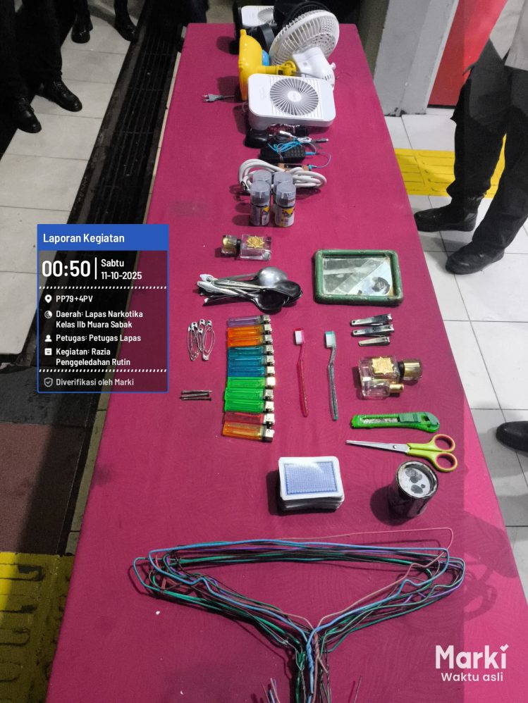 Jambiday.com, TANJAB TIMUR-Lembaga Pemasyarakatan (Lapas) Narkotika Kelas IIB Muara Sabak kembali melaksanakan razia insidentil sebagai bentuk komitmen dalam menjaga keamanan dan ketertiban di lingkungan pemasyarakatan. Kegiatan ini dilaksanakan pada Jumat malam 10 Oktober 2025, dimulai sejak pukul 23.45 WIB hingga 00.45 WIB, dan dipimpin langsung oleh Kalapas Muhammad Askari Utomo.