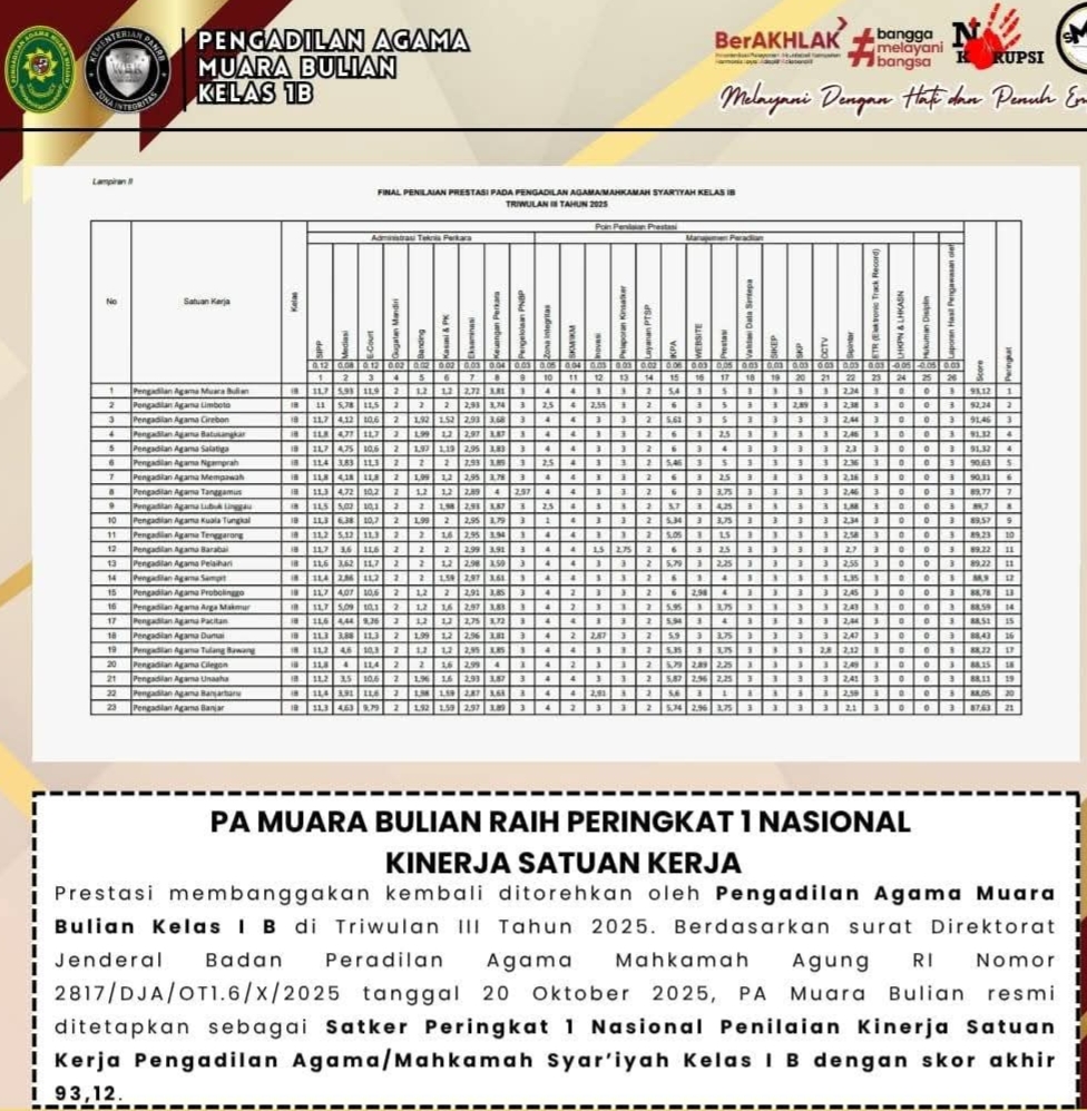 Jambiday.com, MUARA BULIAN – Sebuah prestasi membanggakan kembali diraih oleh Pengadilan Agama (PA) Muara Bulian Kelas I B. Pada penilaian kinerja satuan kerja pengadilan agama/mahkamah syar’iyah kategori kelas I B untuk Triwulan III Tahun 2025, lembaga peradilan yang berada di bawah wilayah hukum Kabupaten Batang Hari ini berhasil menempati posisi puncak nasional dengan skor 93,12.