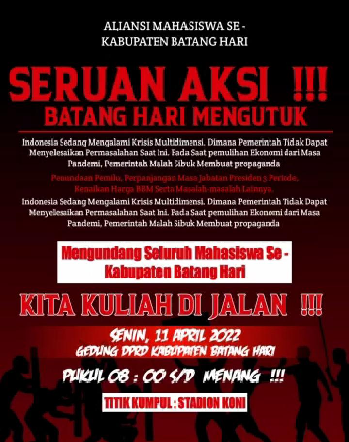 Jambiday.com, BATANGHARI– Maraknya di media sosial (Medsos) atas pemberitahuan bahwa Senin, 11 April 2022 besok, seluruh aliansi mahasiswa di Bumi Serentak Bak Regam akan mengadakan seruan aksi.