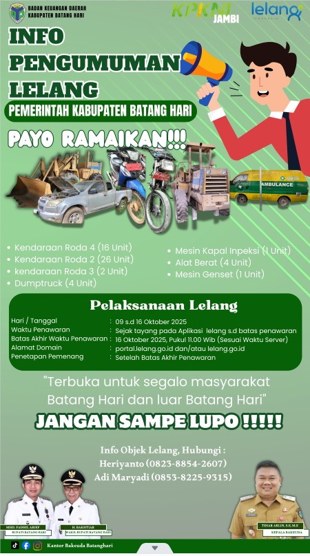 Jambiday.com, BATANG HARI – Pemerintah Kabupaten Batang Hari melalui Badan Keuangan Daerah (Bakeuda) kembali membuka kesempatan emas bagi masyarakat untuk ikut dalam lelang barang milik daerah yang digelar secara terbuka mulai 9 hingga 16 Oktober 2025.